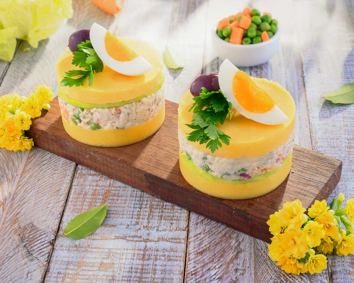 Peruvian mashed potatoes infused with lime and yellow peppers, filled with shredded chicken