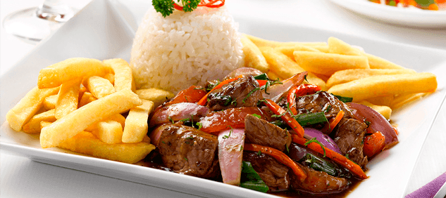 Traditional Peruvian style stir fry using strips of beef or chicken, red peppers, onions, and tomatoes in soy sauce. Served with fries and White rice.